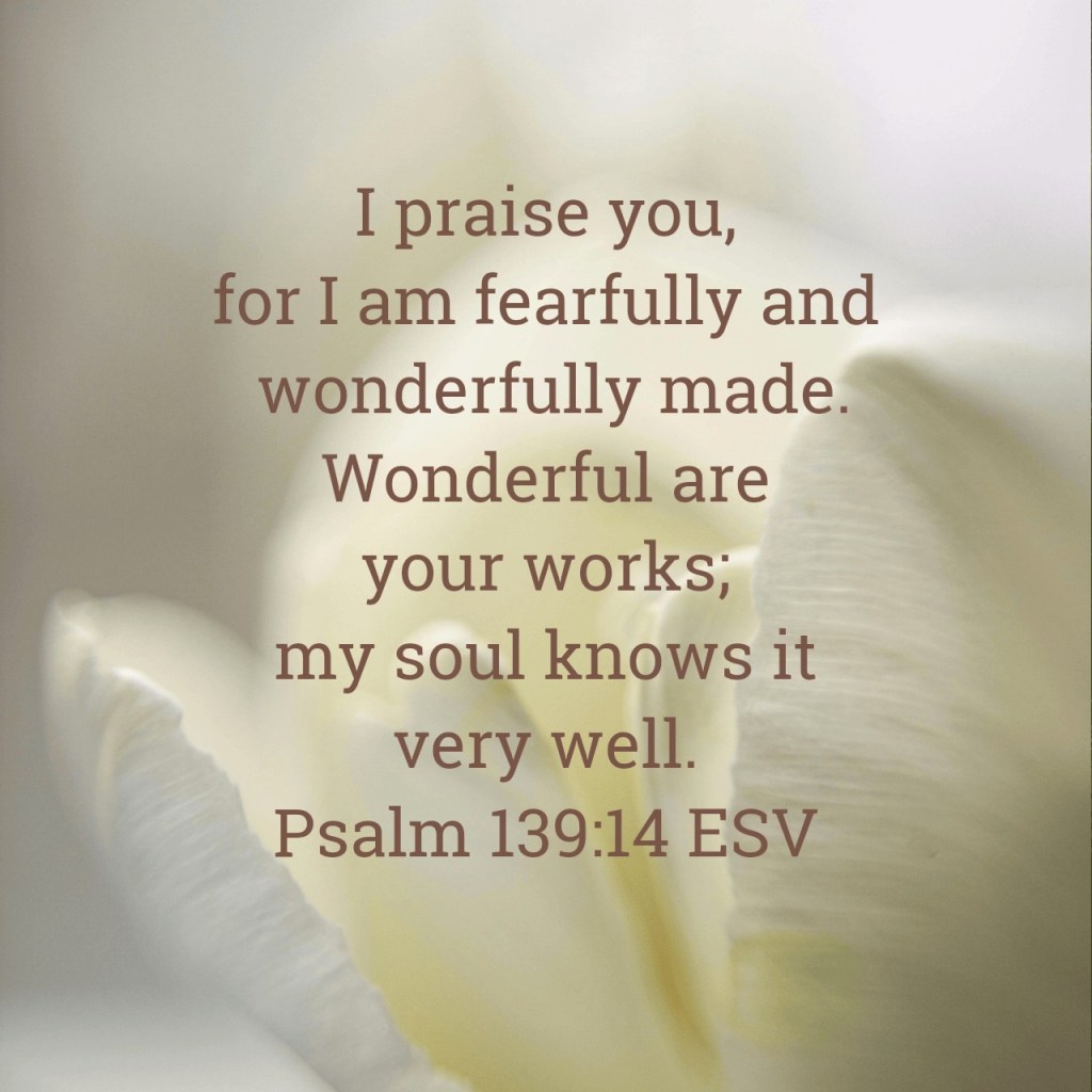 Psalm 139 has been my anchor verse for a long time. In it are the words of truth that tell me that I am not a mistake. I was wanted by my Creator and He designed me just the way I should be. I have been wonderfully made. It has brought me such peace.
